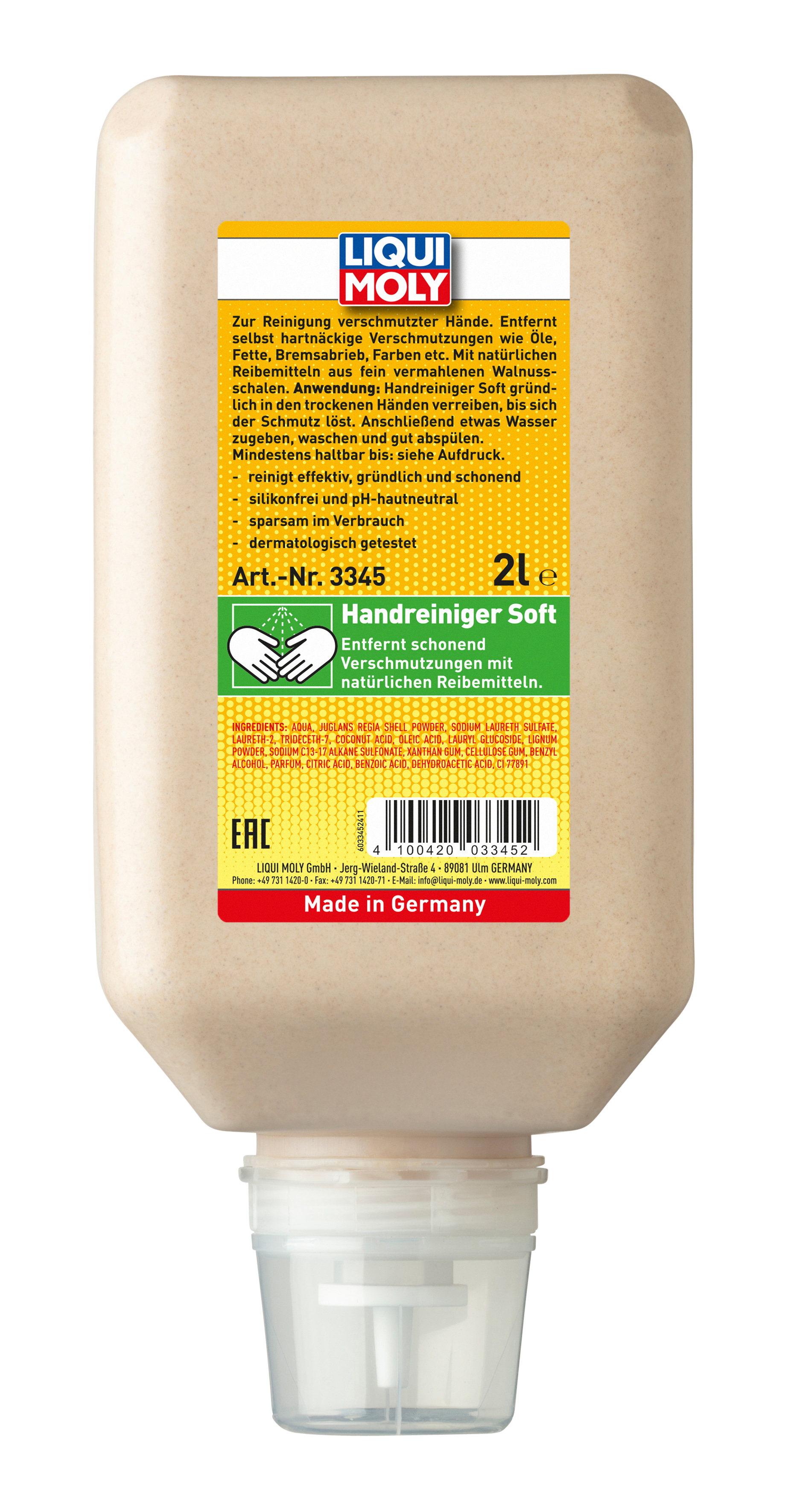 لتنظيف الأيدي بلطف وبصورة شاملة. يزيل حتى التلوثات الصلبة تمامًا، مثل الزيوت والشحوم والقطران والقار والأحبار وما إلى ذلك دون بذل جهد شديد على الجلد. يتكون إلى حد كبير من المواد الخام المتجددة ويحتوي فقط على المواد التي تحمي الجلد وكذلك المواد الكاشطة الطبيعية المصنوعة من دقيق خبز كوز الذرة المطحون الناعم. تم اختبار تفاعله مع الجلد.