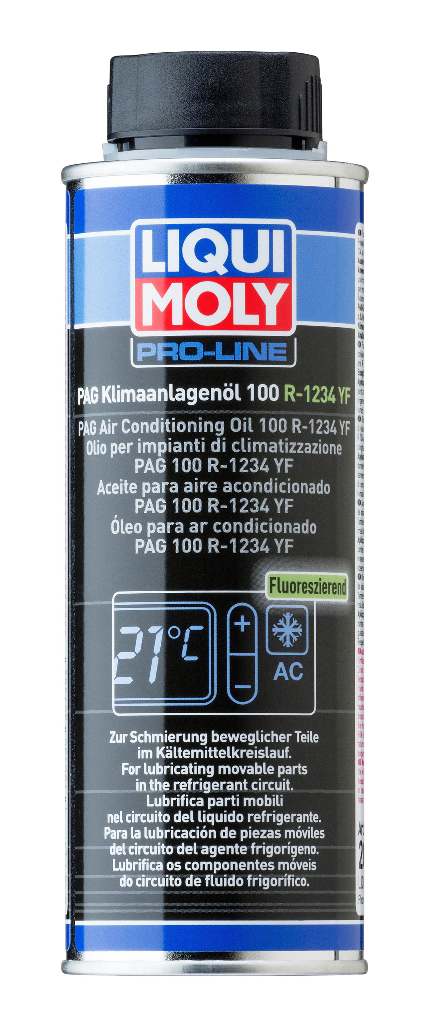 زيت اصطناعي بالكامل يعتمد على جلايكول متعدد القلويات (PAG). لتشحيم الأجزاء المنزلقة والدوارة الموجودة في ضواغط مادة التبريد ودوائر مادة التبريد ومنع التسرب بها وتبريدها في أنظمة تكييف الهواء بمركبات الركاب والمركبات التجارية. يمتزج بشكل جيد مع مواد التبريد من نوع R1234yf وR134a. وهو مسترطب بحيث يمتص الرطوبة من الهواء المحيط، ولهذا يتم تعبئته في ظل وجود النيتروجين. يفي بمتطلبات ضواغط مادة التبريد المهمة وشركات تصنيع نظام التبريد. يتيح اللون المشع تحديد مواضع التسربات بسرعة باستخدام مصباح الأشعة فوق البنفسجية.
